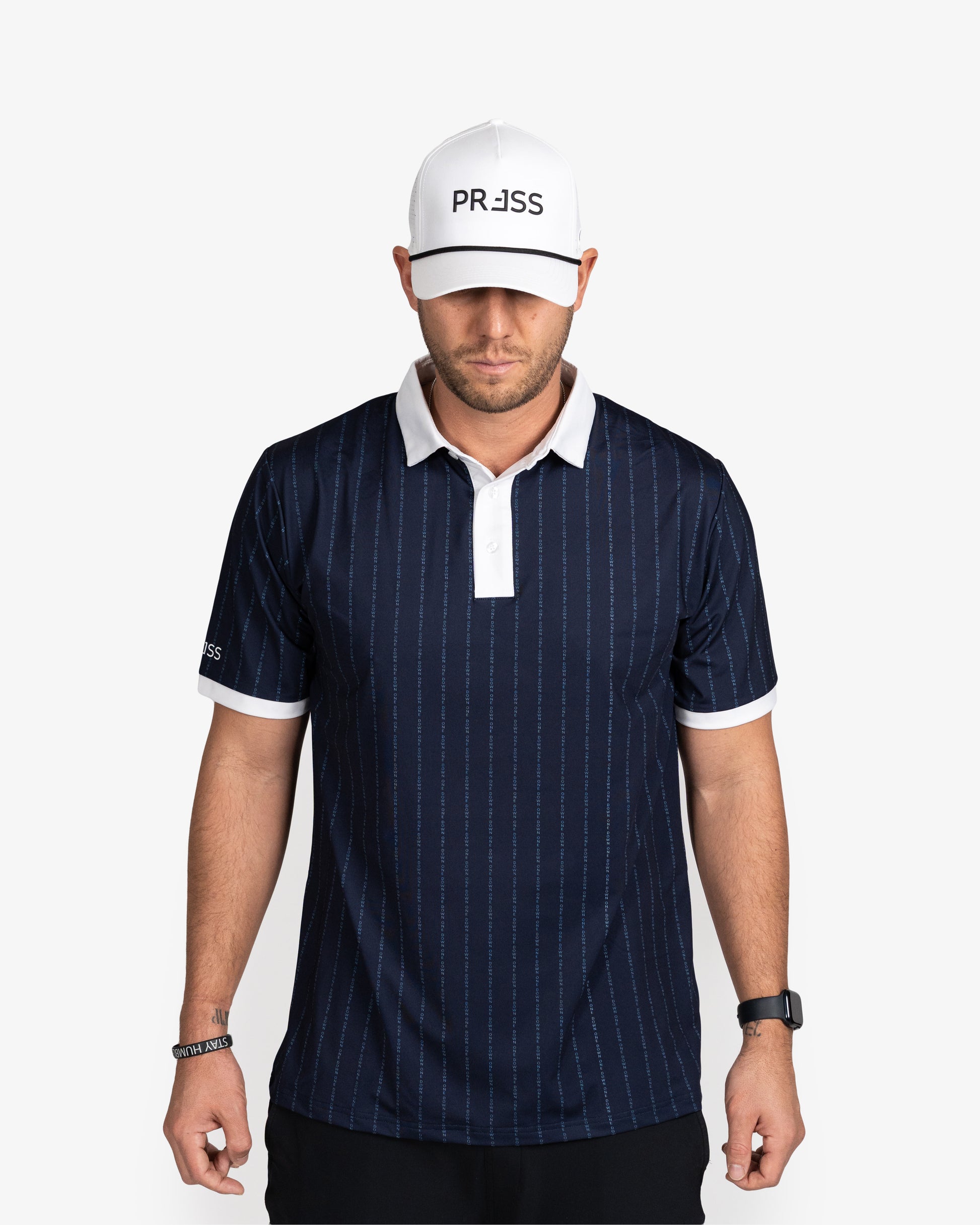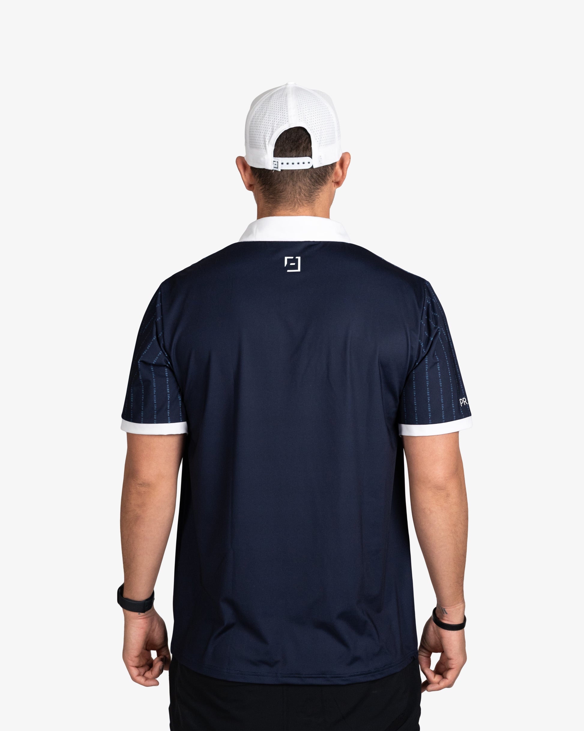 Down One polo built for the moment. Our performance polo, always dialed with our clean-back nine design. Built from a premium 90% poly, 10% spandex blend for the truest, 4-way stretch during play. Our 180gsm-weighted fabric hits that perfect balance: breathable for the course, quality and structure for the clubhouse. And reinforced stitching, fortified collar means it doesn't fold, no matter how much you PRESS.